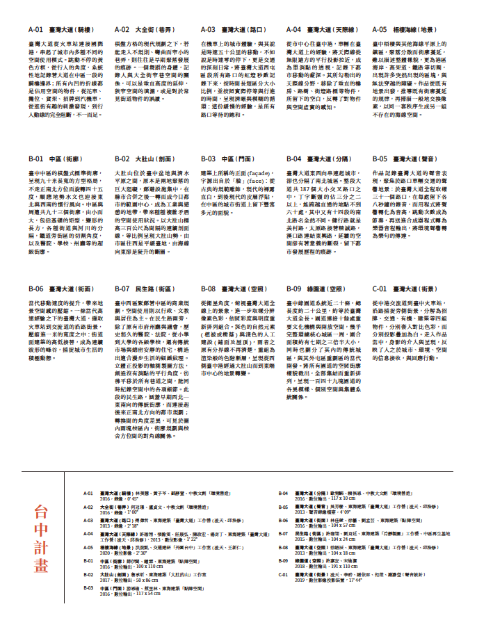 「台中計畫」由環境地景、聚落組織、發展歷史、使用活動、建築類型等層面,分析呈現台中城市脈絡、建築現況與空間表現,以當代地理資訊與視覺呈現工具,蒐集、編譯、轉錄並詮釋空間系統的多層面相。
