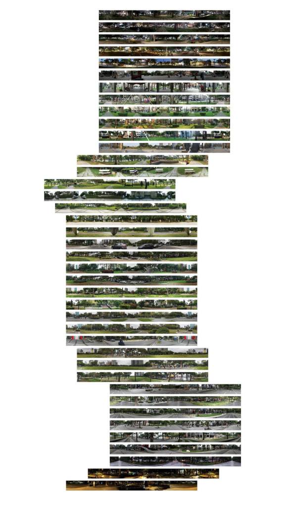 人們總是藉由時間來經驗空間,線性的空間更指涉著時間的流動。我們用一整天的時間記錄了綠園道,既是公共空間的多重切面,也是都市生活的一日即景。從凌晨四點的科博館開始,經過生命演化步道、草悟道、美術園道,到美術館與夜間八時的柳川;我們標記出四十個節點,也把白日的時間四十等分:每一段距離75 公尺,間隔 25 分鐘,等於是以每分鐘三米的速度,極緩慢地環景掃描整段路徑。台灣大道旁的日出,市民廣場上的晨操,下午雕塑廣場的斜陽,晚餐後美村五權的鄰居;時尚而熙攘的綠園道,在一日的時程內,顯得出奇地庶民而日常。