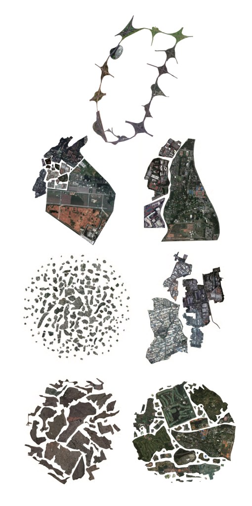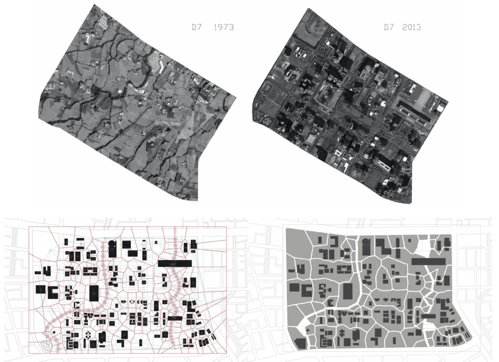 一期又一期的重劃,抹去原有農地水系的自然紋理,取代以開發邏輯、交通機能與法規控管的效率空間;街廓與建築的關係成為固定模式,人性尺度與鄰街活動常為犧牲。「地景邏輯」作品以七期重劃前的地景反向模擬,發展出可以描述河流渠道、灌溉區劃、屋舍位置的模型,保留現有的重劃區建築物,而打開七期下方隱藏的兩條水圳。相同的道路面積之下,細分出有機的街區系統,提高道路的連結,讓鄰里更加可辨;在現況建築不變的前提之下,產生全然不同的街區景觀想像。