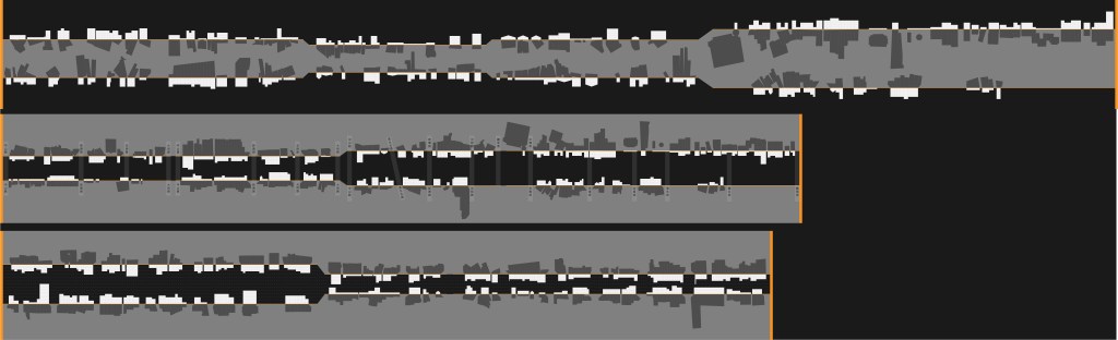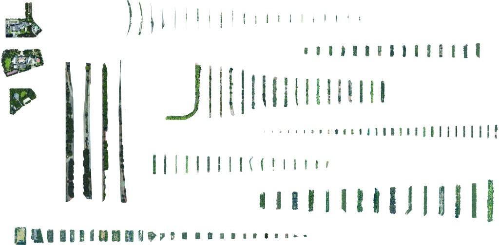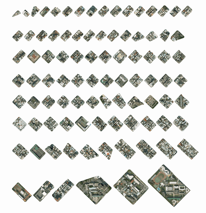 我們將所有園道的空照街廓樣貌截出,全部集結而重新排列,將一百四十九塊園道的高矮胖瘦各異模樣,一次呈現。有些重要地標清晰可辨(如國美館、科博館、市民廣場),但更多不知名地段的園道區塊,在此一一浮出,如同標本一般的陳列,同時強調台中綠園道的集體系統與個別空間價值。