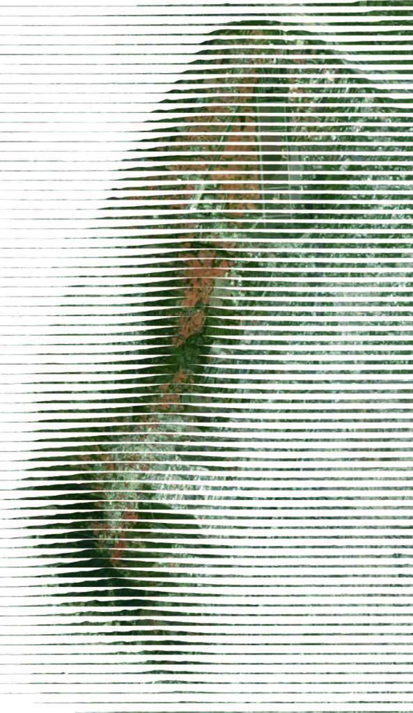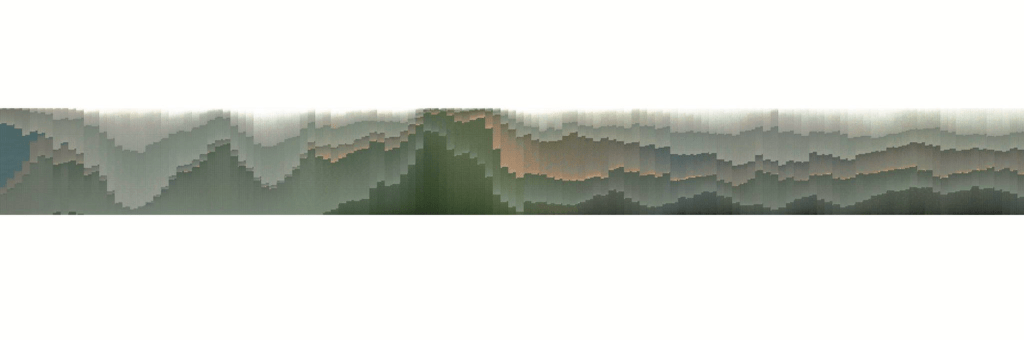 除了城市機能的交通跨接,台灣大道也連結了公園綠帶、水道農田、山坡野林與港口海岸。以衛星俯視角度檢驗台灣大道全線上的地景,而進一步使用參數工具取樣分辨像素色彩,依彩度與明度重新賦予排列規則,則能看到畫面上深色的自然元素(植被或樹蔭)與淺色的人工建設(鋪面及屋頂),原本清楚的分界被擦除,重組為色階漸層。所呈現的結果,不僅可閱讀出各區段土地使用比例消長,紅土與耕地分布等地理狀況,更挑戰了人造與自然的區分概念:原來兩者可以不是非黑即白,而是逐漸轉變的色階進程。