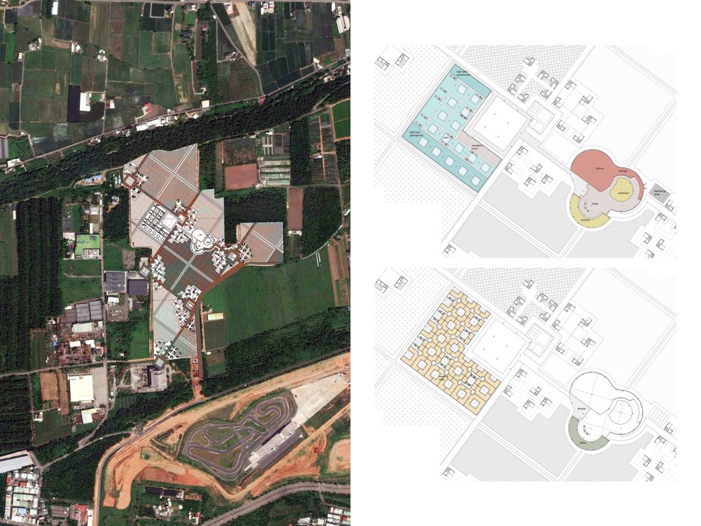 在豐原,位於大甲溪流進平原的入口,早期有農林業集散之便,葫蘆墩圳更是灌溉整個盆地的水系起點,是台中市區內綠川、柳川、梅川、麻園頭溪與筏子溪的共同源頭;我們更加強調水圳的存在感與重要性,由花博公園內部的水岸,向外擴張到整個城市對水的空間感知。在后里,早年大規模的蔗田墾植與糖廠建置,土地所有權與使用方式集中,日後整批轉為軍區、工業園區與遊樂園區,以至於今日后里小巧的鄉鎮核心,為超大型園區廠房、營區圍牆包圍阻隔。對於后里的提案,選定園區的圍牆邊界,結合單車交通與服務系統,融合共享、租借、代步、運動、遊憩、體驗等層面,作為社區日常與觀光活動的空間中介。外埔位於大甲溪與大安溪之間的河階地形之上,介於台地上、下兩處較大聚落(后里、大甲)之間,人口密度低,主要是鄉鎮過渡的農業地帶。為了對應農地被佔用開發的現況,計畫提案將園區回歸農用,惟保留兩處主要建築作為住宅與公共空間,將長住與短租的農民與帶回農地,重新建構「農」(耕作)「村」(居住)的空間組織;以小規模、富適應性而在地的農村空間,對應大規模觀光遊憩開發的基地周遭狀況。