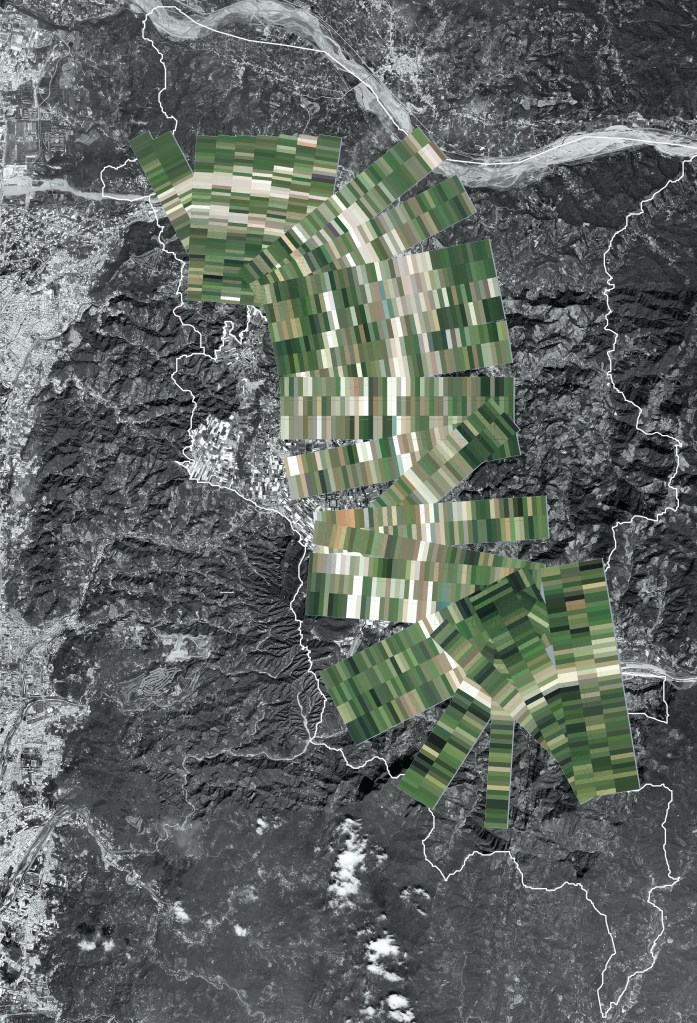 新社、東勢與石岡,沿著大甲溪河谷分佈,是山林產業與遊憩的門戶;無論石岡的鐵(馬)道與水壩,東勢的長向聚落,或新社的台地農作,都與河谷地形息息相關。作品將三區聚落拼回連續的谷地地形,統計不同高度、坡度之上的土地使用模式,疊合衛星圖與三維地勢模型,寫出一個從空照圖猜測描繪剖面線的河谷遊戲,考驗對地貌的觀察與理解力,回應實地踏查時對於地形戲劇性改變的強烈印象。