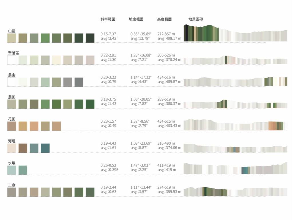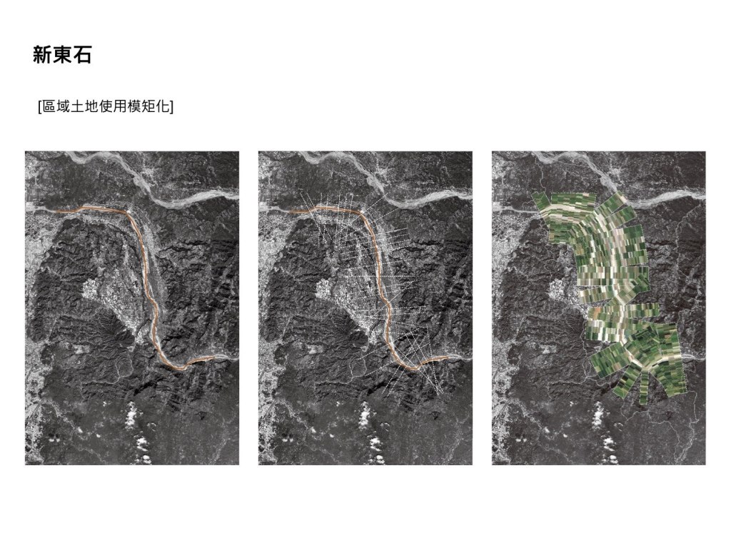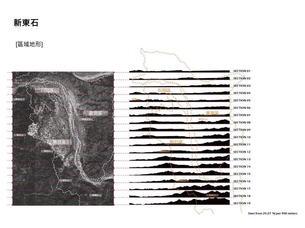 新社、東勢與石岡,沿著大甲溪河谷分佈,是山林產業與遊憩的門戶;無論石岡的鐵(馬)道與水壩,東勢的長向聚落,或新社的台地農作,都與河谷地形息息相關。劉家宏將三區聚落拼回連續的谷地地形,統計不同高度、坡度之上的土地使用模式,疊合衛星圖與三維地勢模型,寫出一個從空照圖猜測描繪剖面線的河谷遊戲,考驗對地貌的觀察與理解力,回應實地踏查時對於地形戲劇性改變的強烈印象。