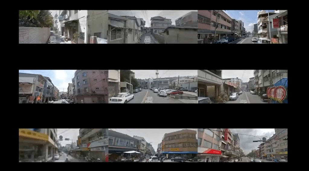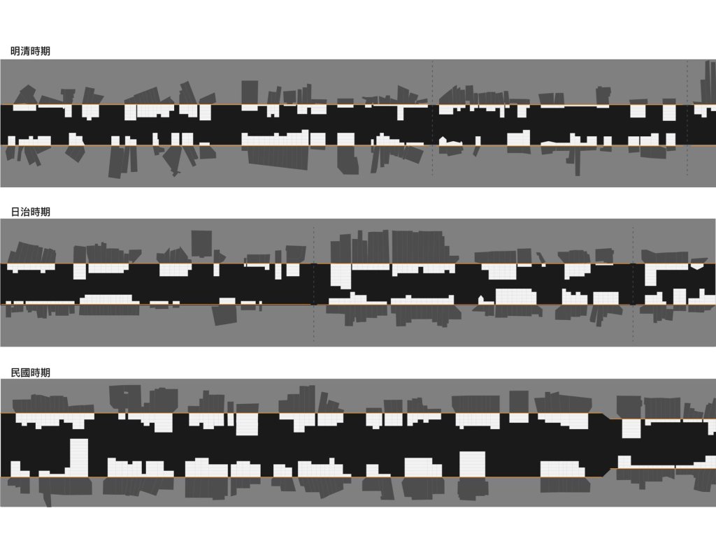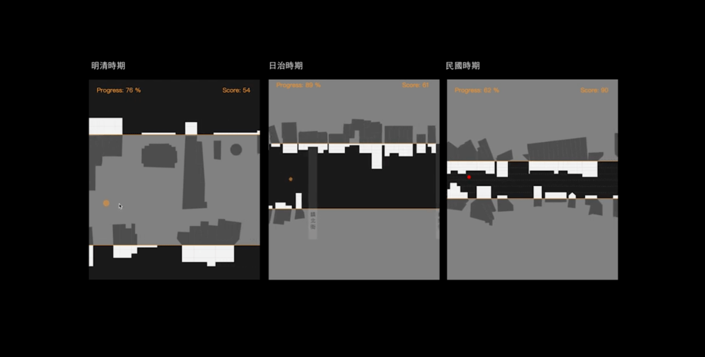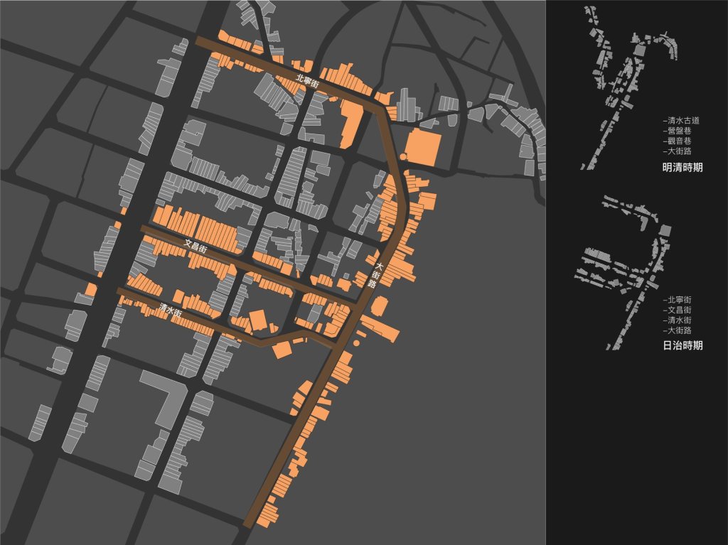 清水的空間組成,是不同年代中巷弄街道穿梭的身體記憶。鄭羽均整理了清水歷史三個階段的巷弄地圖,描繪街道寬度、參差立面與行走經驗,分別寫出三組橫向捲軸遊戲:明清時期狹窄巷弄裡的電流急急棒,日本年代屋頂與山牆街面的鳥飛遊戲,以及民國後馬路上的賽車競技,巧妙編織起平面圖中的空照視野與街景圖上的行人角度。