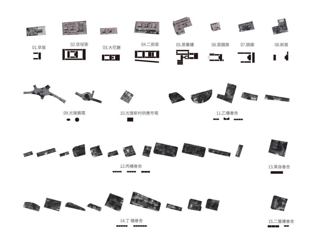 孫煥安找到霧峰的兩組重要聚落群:林家宮保第園區與光復新村,整理兩區各自的建築形式、群聚關係與衍生邏輯。設計作品受到桌遊的啟發,從隨機底圖的圖塊旋轉交換開始,構成特定模式,以生成眷村的線性空間序列,以及林家的傳統聚落團塊。以投影光桌呈現的互動地圖,配合立體印出的建築棋子,共同組成跨越數位與實體的空間遊戲實驗。