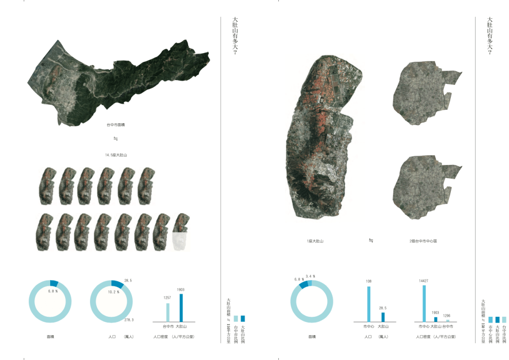 「大肚的山」展覽,呈現我們對這塊地域的調查研究初步結果:從尋找大肚山的定義開始,由邊界、地貌、發展歷史、使用現況等方式,呈現大肚山的各種空間面向;而後進入園區與地景的分析比較,聚焦於工業與遊憩、兩種今日大肚台地上最重要的機能使用之上。最後,我們以大肚山的分解與重構,試圖詮釋大肚空間經驗的多種可能。