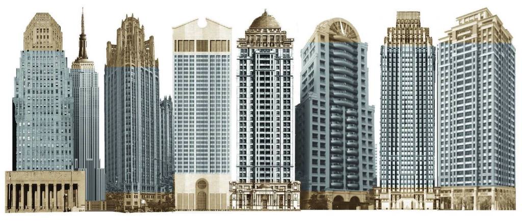 新古典風格的豪宅外觀,回應傳統三段式的屋頂、屋身、基座形式,強調屋頂與底座的表現型態,挑高圓頂柱廊塔樓等等內部,僅是容納少人使用的公共設施與設備空間,而忽視真正供給居住的中段屋身之設計本質。