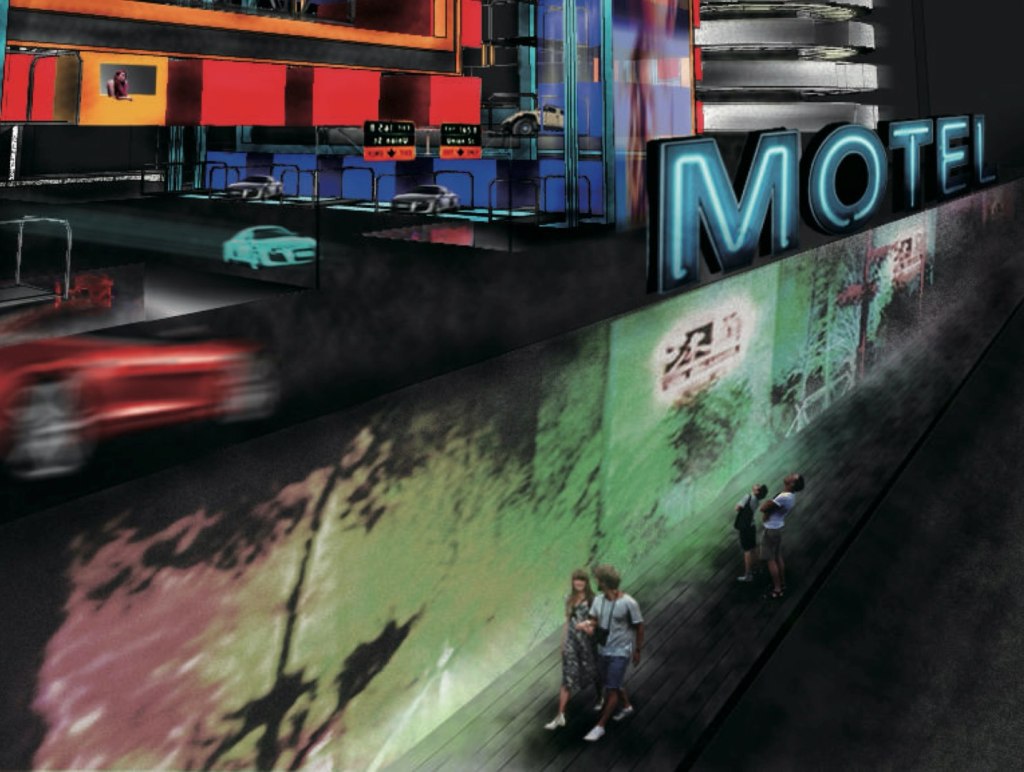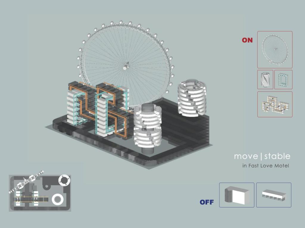 汽車旅館體現車與人的移動與停留,包含車內空間、車輛空間以及室內空間三種層次。「快愛旅店」提案,整併 2012 年仍在七期營業的八百餘間摩鐵房間,創造結合汽車與空間動態可能的機動樂園。汽車移動(道路與機械停車塔)與空間移動(摩天輪或纜車),加入到旅館房間短暫使用的不同速度,確保每次進入的體驗。免下車出入房確保隱私,高層移動房飽覽七期夜景,一種動態摩鐵新體驗即將在 Fast Love Motel 展開。