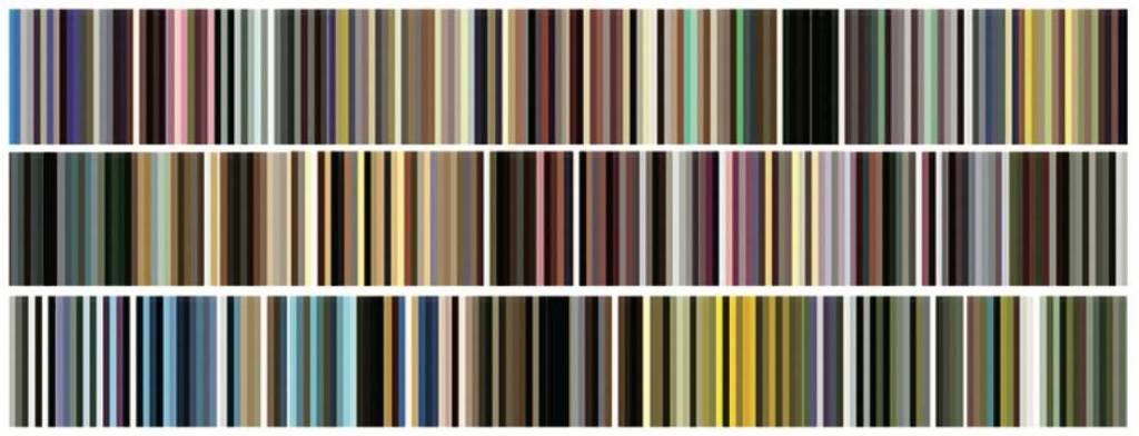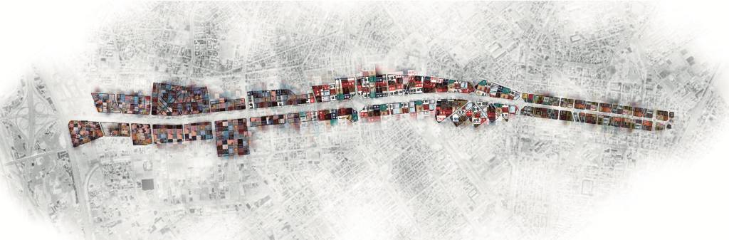該如何記錄一個都市的顏色?當個別照片只代表一位攝影者的取景角度,也許可以從群眾累積的影像記錄開始來建構集眾的視覺印象。來自實踐建築的柯盈瑜,使用 Foursquare 上使用者在台灣大道打卡上傳的許多照片,送入顏色分析的應用程式中,將一張張照片的色彩攤開成光譜條碼。各組條碼沿著地理位置排列,配合中港路立面樓層高度作為背景,掃瞄地景時也掃過所有照片與其顏色元素組合。作者並進一步檢視色彩條碼,找到常出現的色系,從黃綠到淡紫,以 Pantone 色票表達台中港路區段的代表色。條碼的掃瞄,與色票的使用,都暗示著資訊的存取與閱讀,讓都市的色彩取樣繼續轉化,成為下一步設計的出發點。