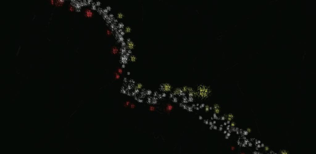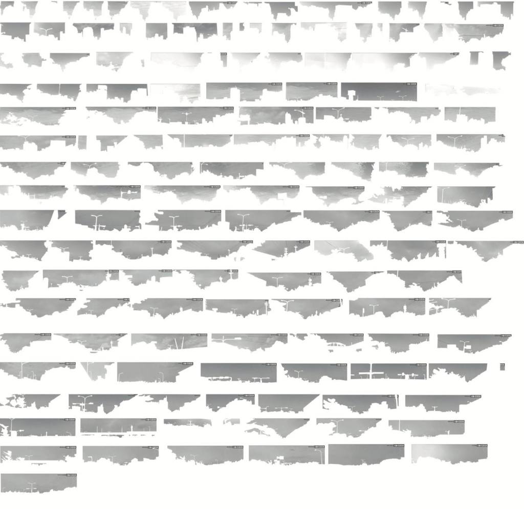 我們總喜歡在衛星或空拍鳥瞰照片上辨認地方,找尋人造或自然環境的邏輯與無序。徐語辰以同樣的俯視角度檢驗台灣大道全線上的地景,而進一步使用參數工具取樣分辨像素色彩,依彩度與明度重新排列組合。畫面上深色的自然元素(植被或樹蔭)與淺色的人工建設(鋪面及屋頂),原本清楚的分界線於是被擦除,重組為色階漸層。所呈現的結果,不僅可閱讀出中港路各區段土地使用比例消長,黃土耕地分布趨勢等等地理狀況,更在根本上挑戰了區分人造與自然環境的概念:原來兩者可以不是非黑即白,而是逐漸轉變的灰階進程。