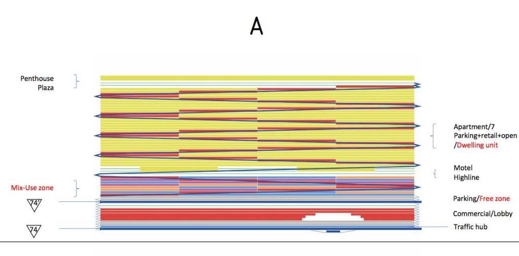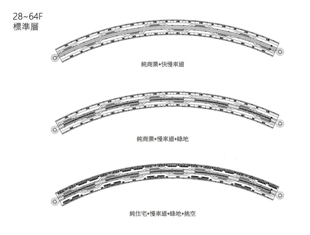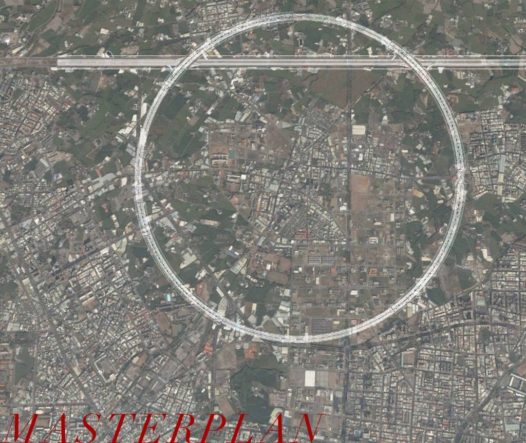 「穿托邦」計畫,一方面配合台中高度仰賴汽車的生活方式,與環中路高架橋直接結合;另一方面提出四排巨型結構,容納不只是十四期、還包括其他目前台中重劃區的所有計畫人口居住生活。如此高密度的空間利用,垂直整合高效率的生活機能,創造出不落地的重劃區,是對應目前低度無效開發方式的建築抵抗。
