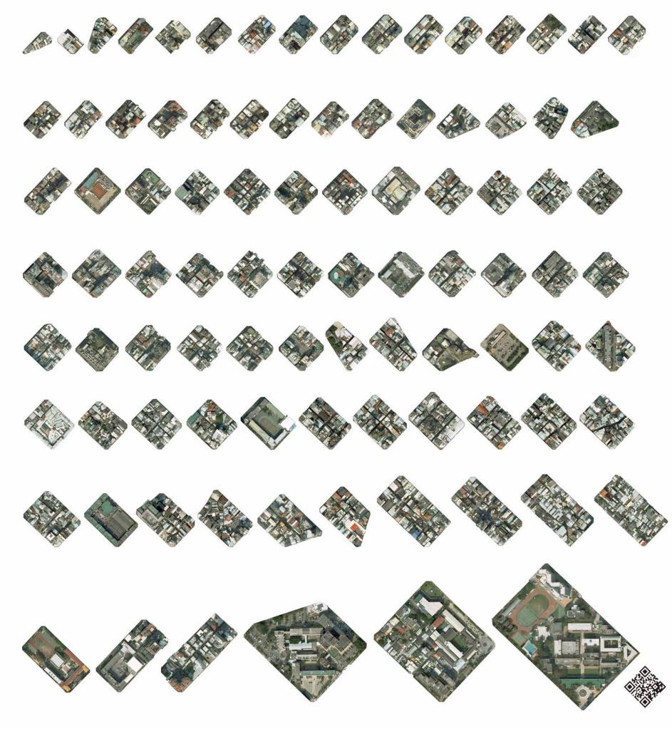 台中中區的棋盤式標準街廓,呈現九十米長寬的方型格局,不走正南北方位而旋轉四十五度,迎接東北與西南的慣行風向。這份作品整理了中區與周遭共九十三個街廓,以動畫與陣列方式呈現其演變,由小而大,包括基礎的矩型,變形的長方,各種街道與河川的切割,鐵道旁街區的斜切角度,以至於醫院、學校、州廳等的超級街廓。規格中的變化,保留著台中作為台灣第一個都市計畫特區的初始原型,更呈現出日後都市生活發展的多樣特性。