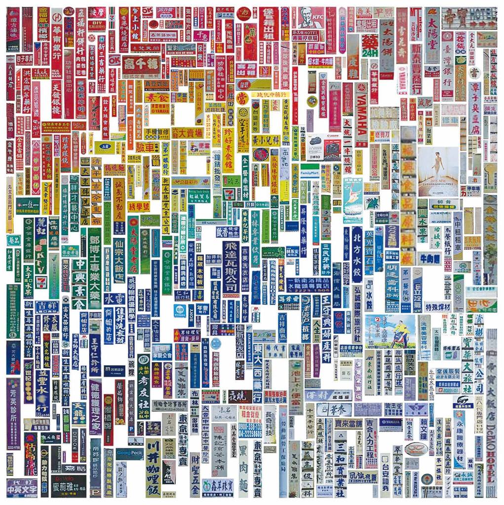 四處可見的招牌是台灣都市中最理所當然的空間景觀。招牌的本質,是在視覺上創造獨特的識別性,招來注目後再提供資訊消息;於是常見到強烈對比,突兀特出而互不相讓的表現。為了看到店招本身,而不只是其呈載的大量衝突訊息,我們使用網路街景服務,取下中區街面上大量垂直街面的招牌,將其與周遭環境脫開,重新排列組合。鮮明的漸層色階,似乎可以讀到不同服務的顏色偏好,彷彿將中區街道面完整攤開於面前,一次收入眼底。