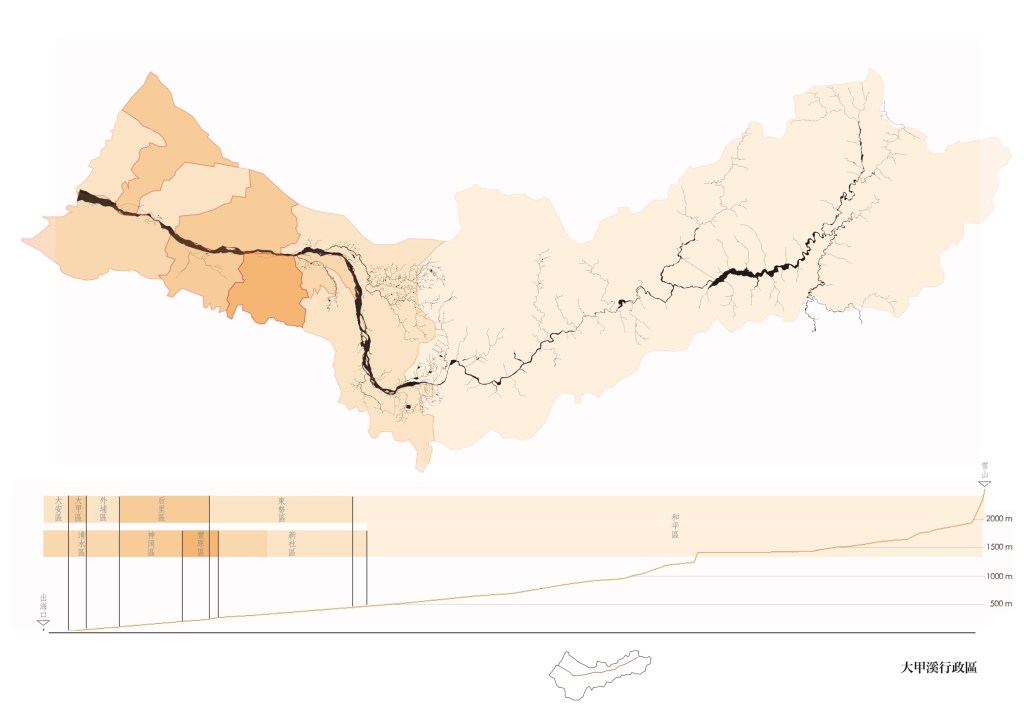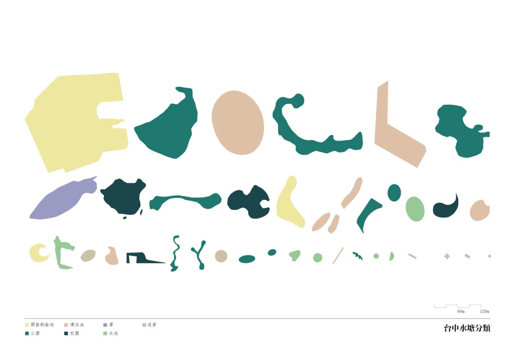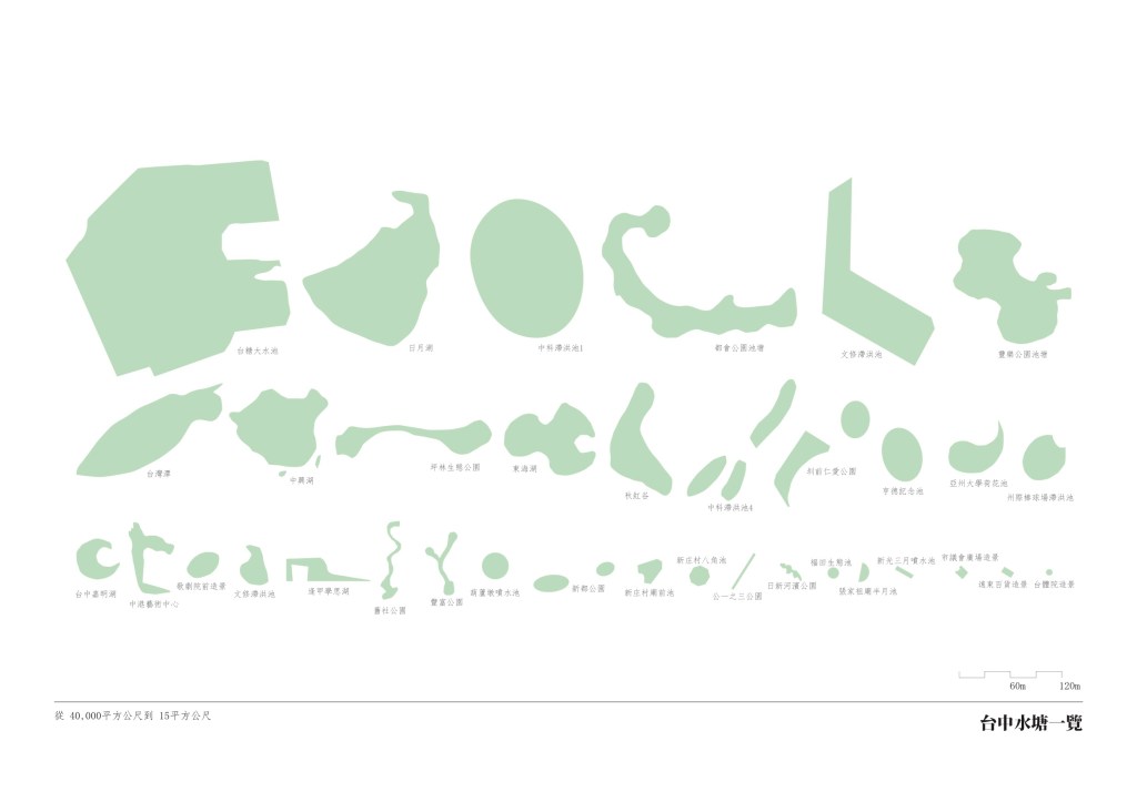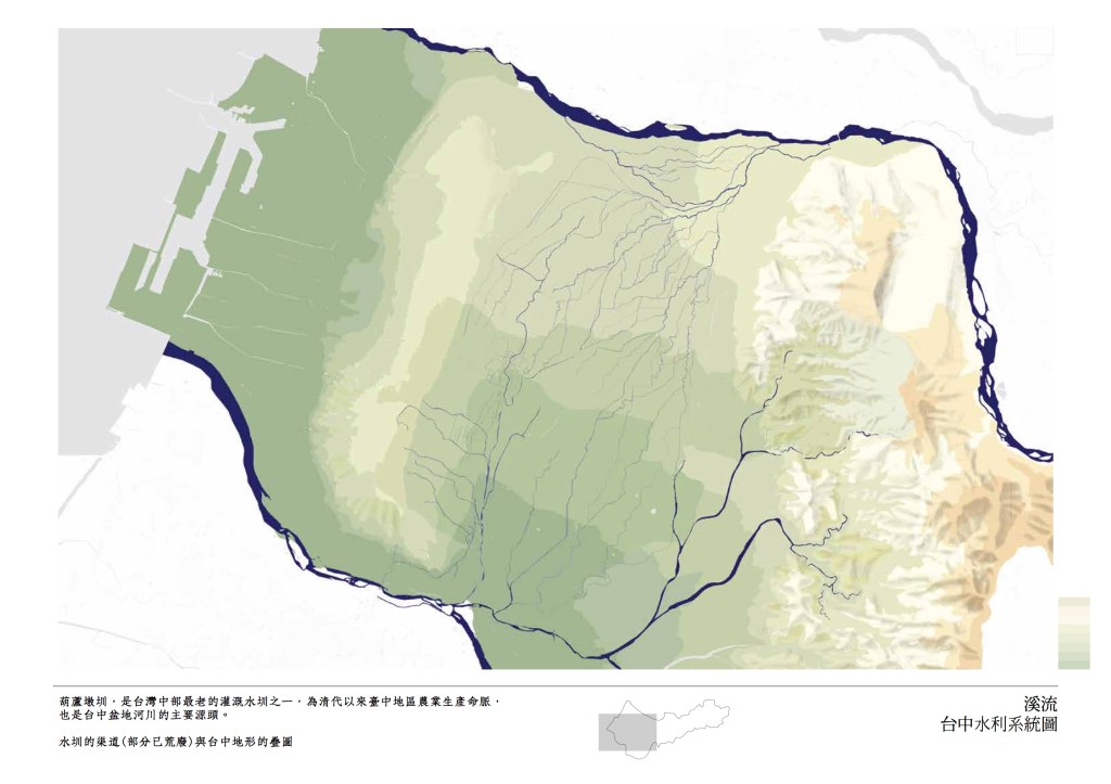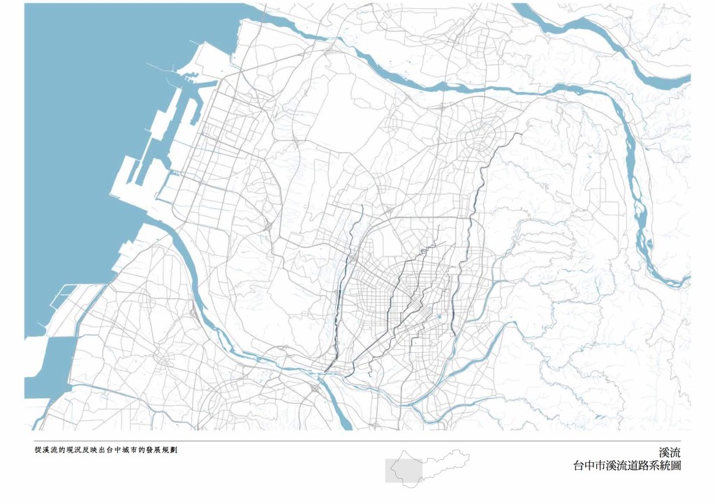 台中由水定義而成:城市分別以烏溪(大肚溪)、大安溪為南北界線,中間則完整包含大甲溪全部流域,三條河川便勾勒岀了台中市的整體輪廓。市區旁有旱溪,筏子溪等中型河川,以及流經城內的綠川、柳川、梅川,麻園頭溪等小型水道,均與都市關係密切,卻多處遭人工加蓋或截流。台中市約有四十公里海岸線,一半以上為港區和電廠所使用,無法為大眾接觸。高美濕地近年成為都會休閒去處,卻是工業與戰爭地景的副產物。市區內的湖泊,秋紅谷、台糖湖或「嘉明湖」均為人工地景,永續前景不明。台中有難得的整體都市水系紋理,卻在都市發展中失去整體空間意義。