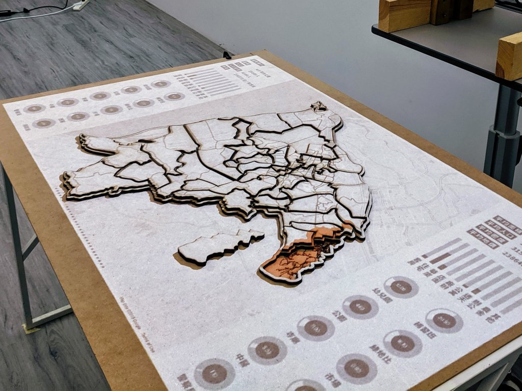 陳芳昱的作品以國小為參照原點,爬梳新竹市 31 處學區之基本資料,整理為一個平均學區,呈現國小學校作為社區生活核心的概念,製作為 31 學區的互動地圖投影。