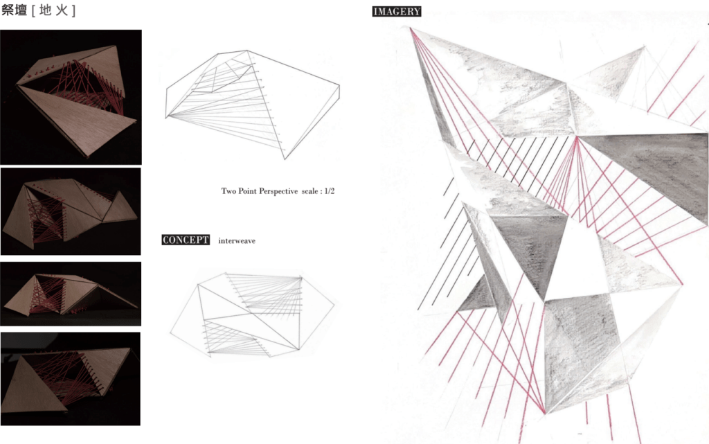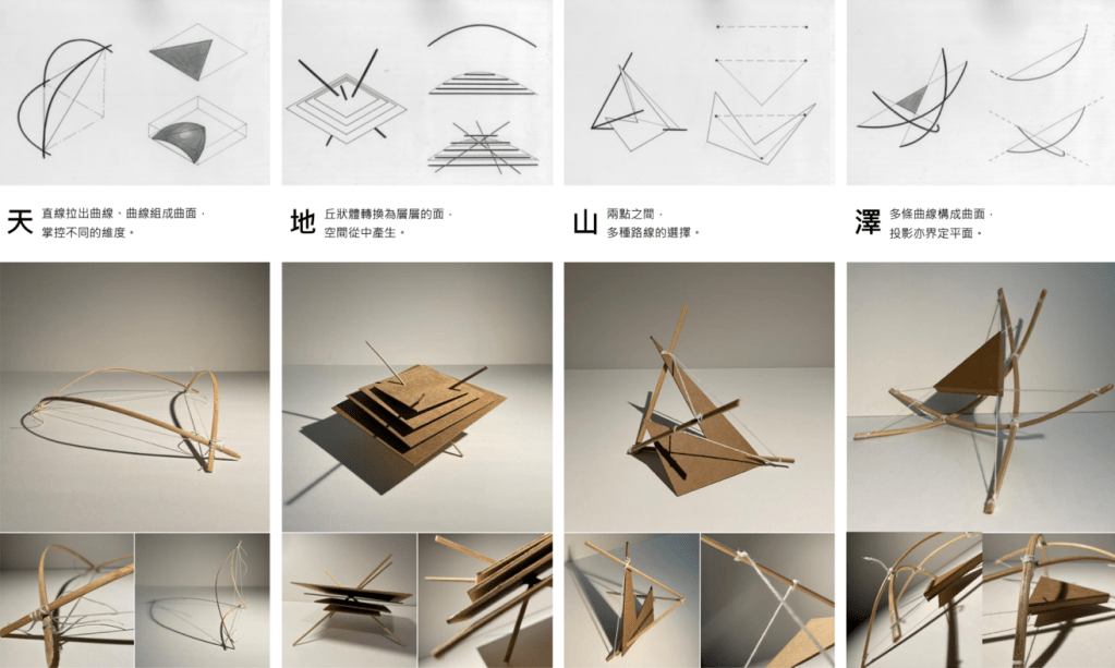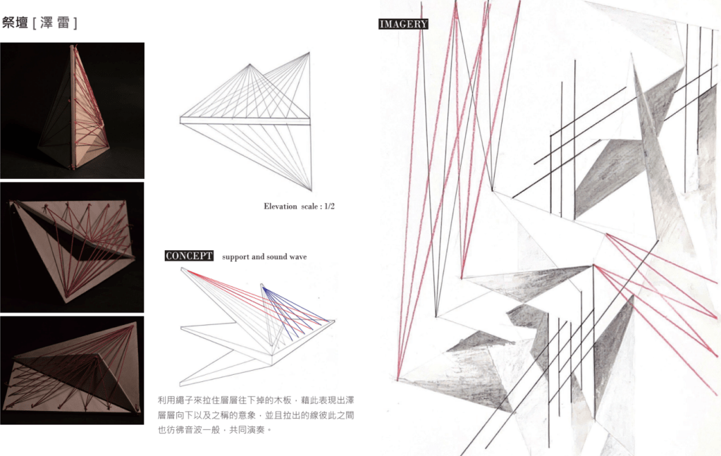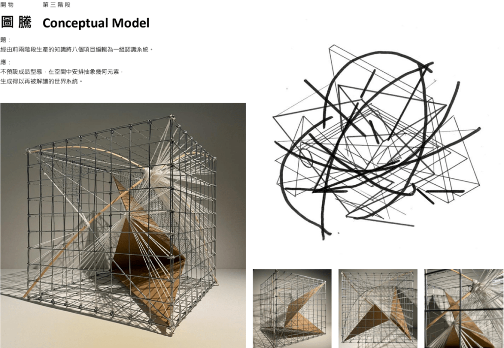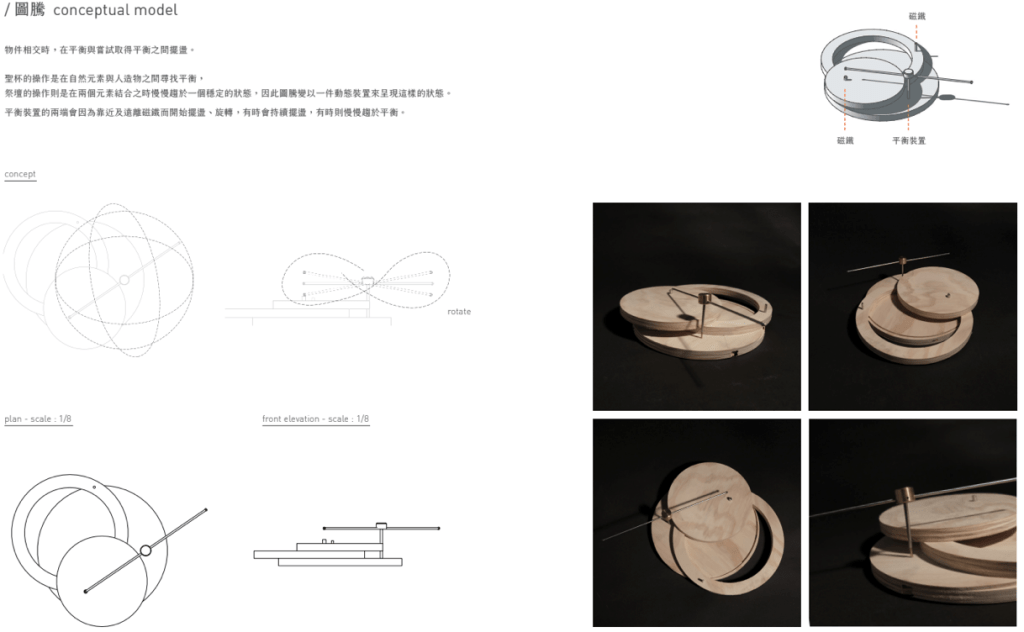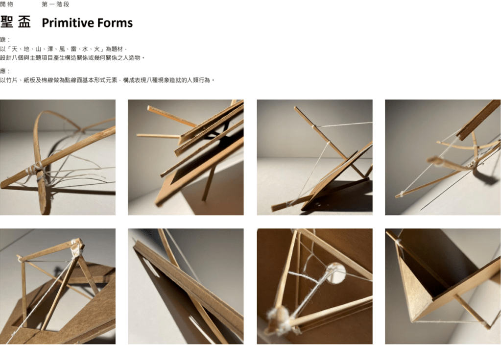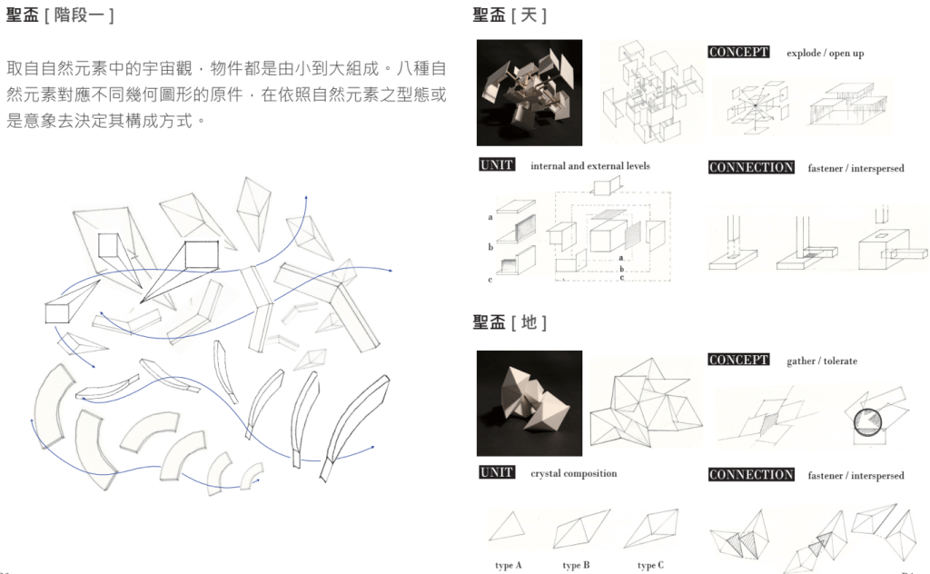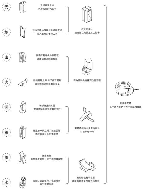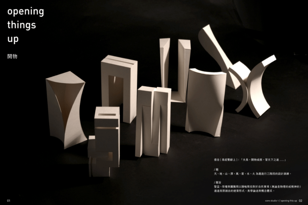 「夫易,開物成務,冒天下之道,如斯而已者也。」 「開物」:由天、地、山、澤、風、雷、水、火為題材,進行三階段共六週的設計演練,建構一套空間物件與量體構造的語言,闡述對於現象(物理的或精神的)通達而原創出的建築形式、美學論述與概念體系。 聖盃:8 個人造物的構造關係或幾何關係。 祭壇:兩兩項目媒合,產生 4 組環境意義的關聯。 圖騰:設計 1 個裝置,將前兩階段生產的知識,編輯為一組認識系統。