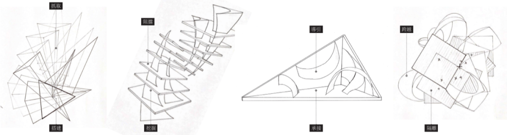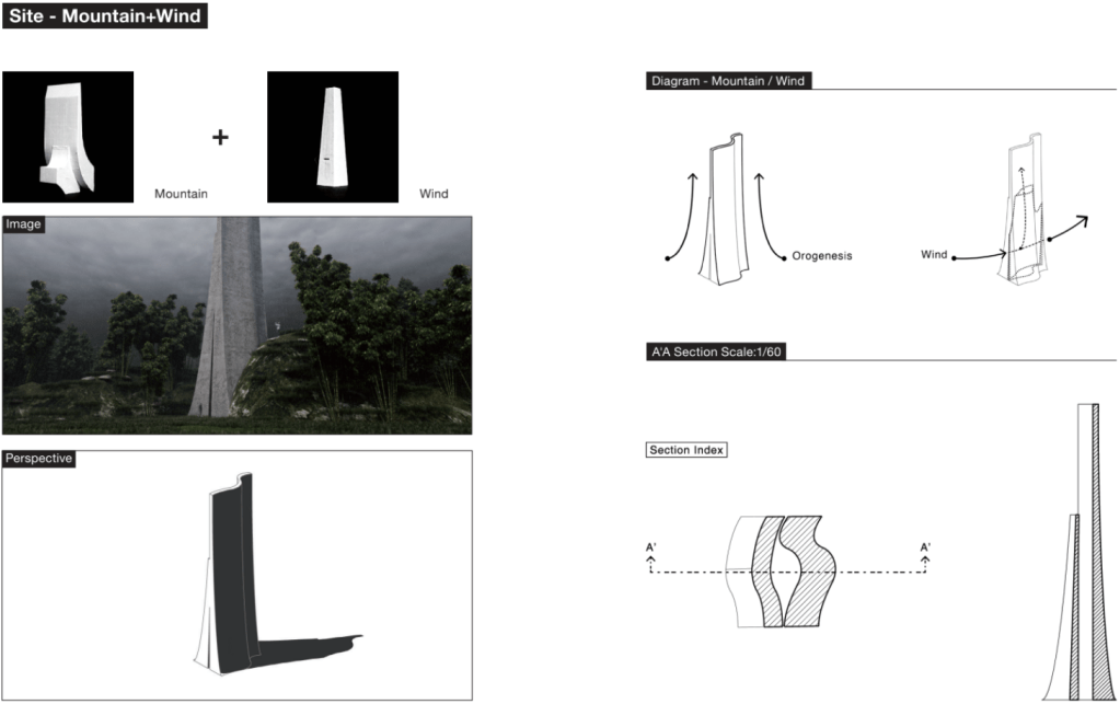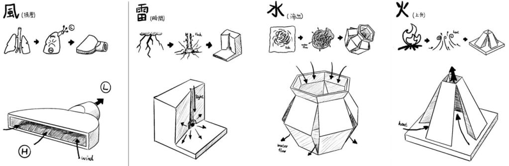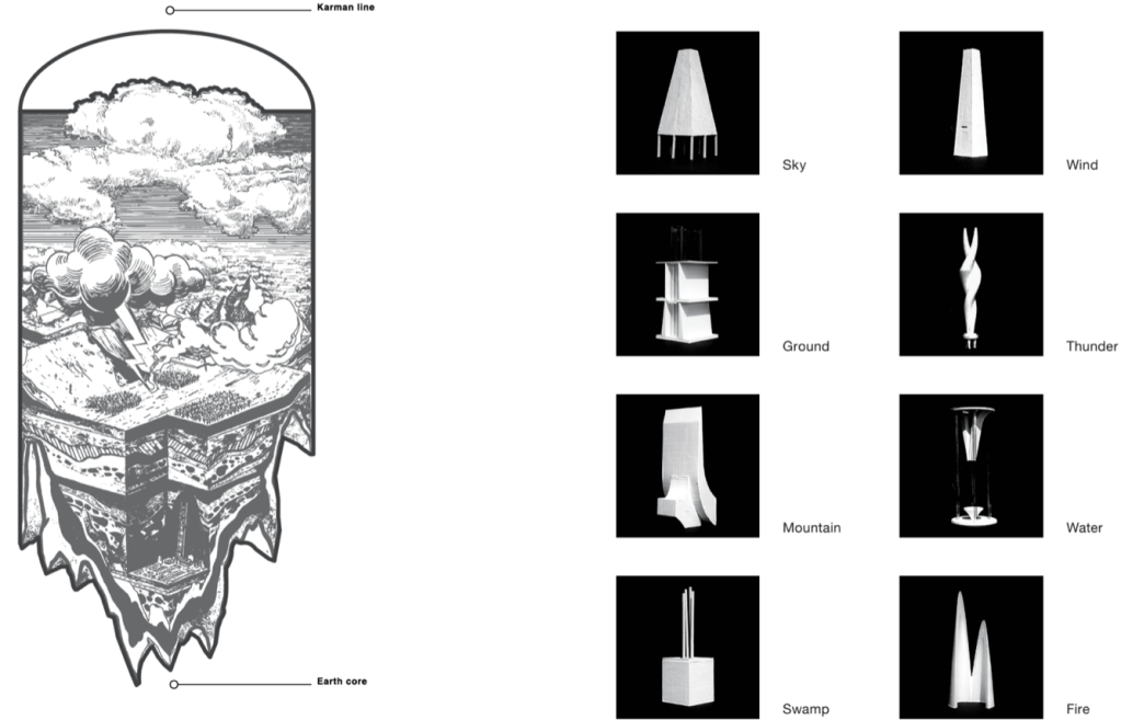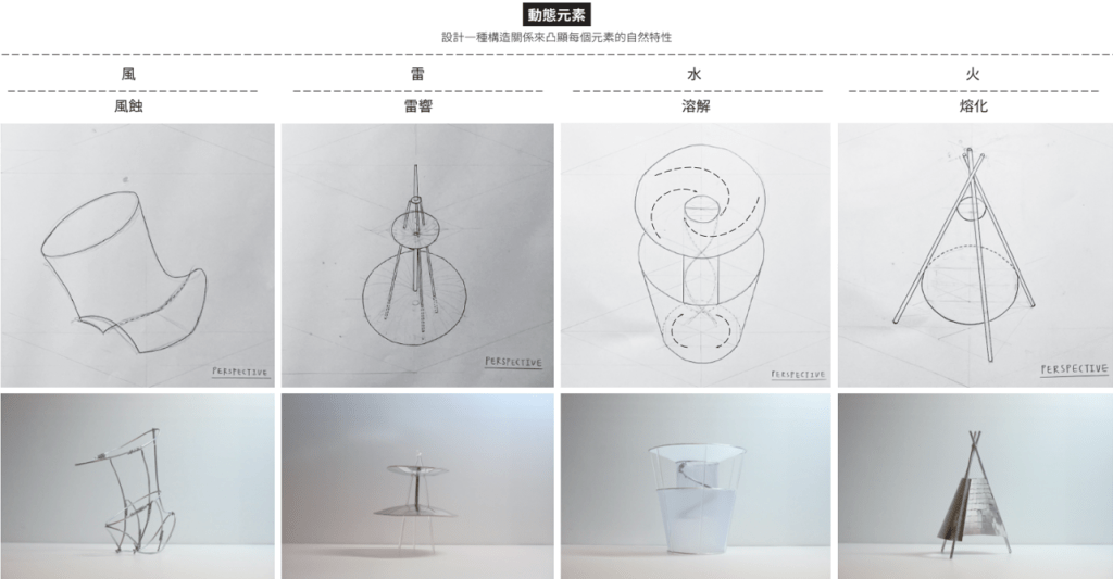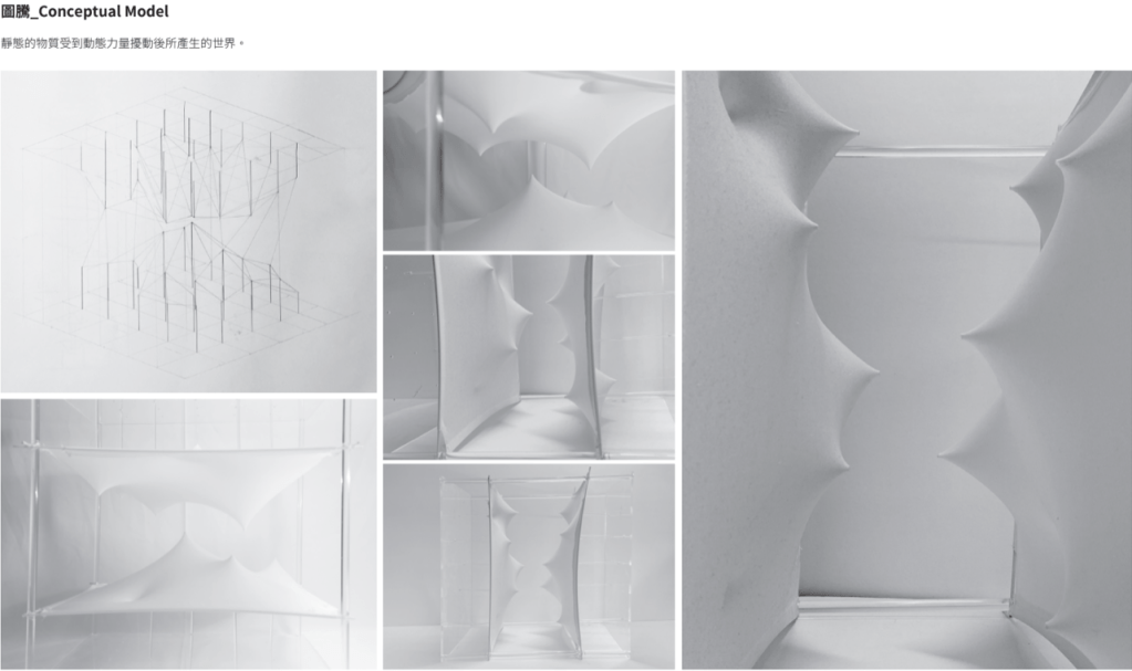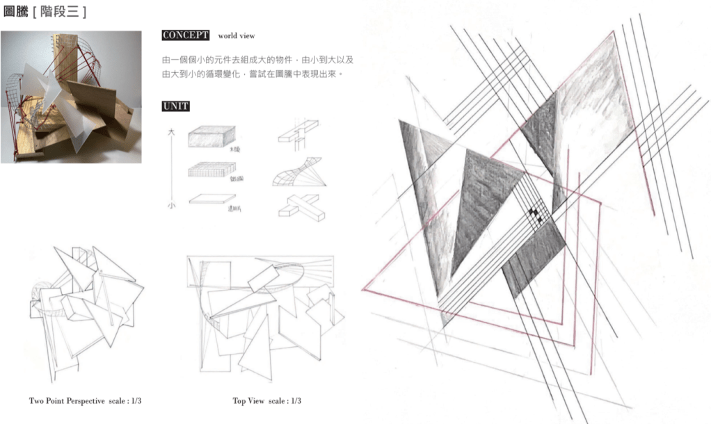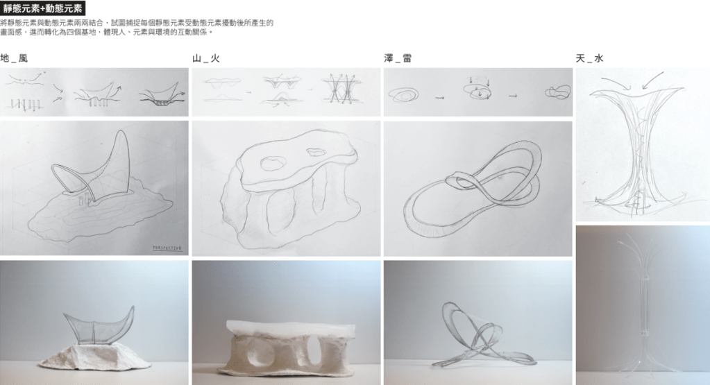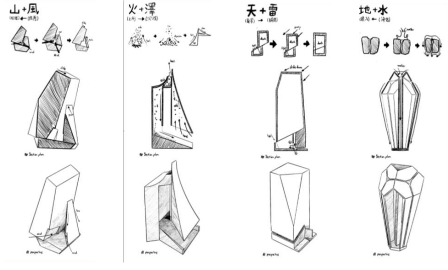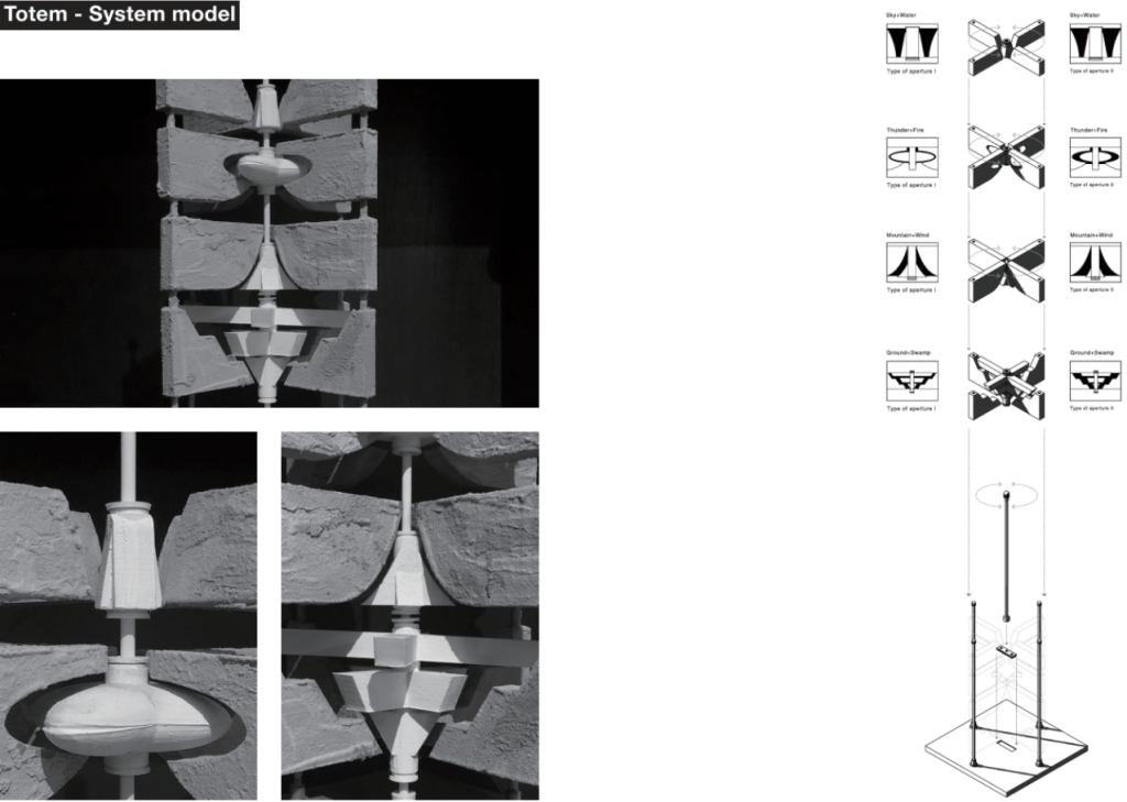 「夫易,開物成務,冒天下之道,如斯而已者也。」 「開物」:由天、地、山、澤、風、雷、水、火為題材,進行三階段共六週的設計演練,建構一套空間物件與量體構造的語言,闡述對於現象(物理的或精神的)通達而原創出的建築形式、美學論述與概念體系。 聖盃:8 個人造物的構造關係或幾何關係。 祭壇:兩兩項目媒合,產生 4 組環境意義的關聯。 圖騰:設計 1 個裝置,將前兩階段生產的知識,編輯為一組認識系統。