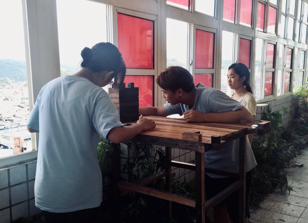 我們決定用一整天的時間,細密記錄從學校遠眺城市與港口的景觀。將二十四小時,除以一百六十二扇窗子,則每一面窗景約是九分鐘間隔。設計了一個機台,簡單的木架上固定四個相機位置,同時能向走廊外的東側港市、南北兩端的走廊盡頭、以及背後的整排教室拍照,像是自製的街景攝影車一般。每隔九分鐘,我們移動一次台座,面對一扇新的窗景,記錄四方的影像,總共重複一百六十二次,從白日到天黑,午夜又到早晨。